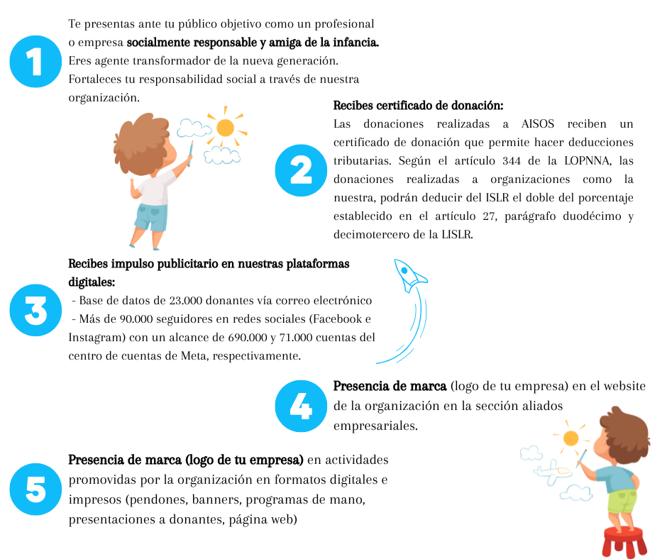 ▶️ Podrás posicionar tu marca ofreciendo un descuento o beneficio (mediante presentación de sticker*) para los donantes individuales que aporten en favor de niños y niñas y reciban la agenda. * Los beneficios de los stickers estarán disponibles del 1ero de enero al 31 de diciembre de 2024.